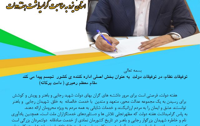 هفته دولت، فرصتی است برای مرور داشته های گران بهای دولت شهید رجایی و باهنر و پویش و کوشش برای رسیدن به یک مجموعه عدالت محور، متعهد و متدین با خدمت خالصانه به خلق. شهیدان رجایی و باهنر توانستند عشق و ایمان را به مردم ارزانی کنند و خدمات شایانی به همه مردم به ویژه محرومان ارائه دهند.